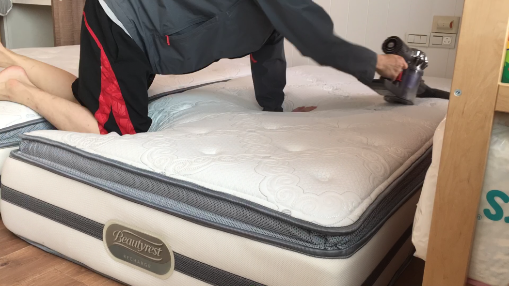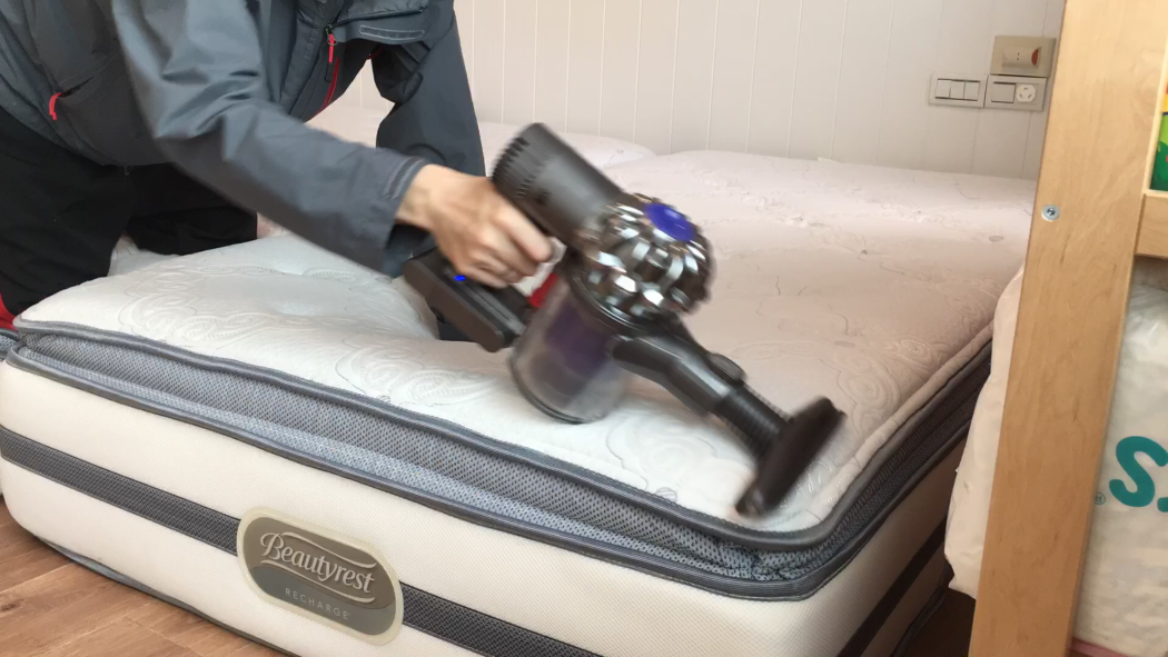 3)然後再補上一記絕殺:每天用吸力不減及價格也硬是不減的手持式吸塵器吸床墊、枕頭、孩子的被子、遊戲軟墊,重點在於把床墊上的小皮屑吸乾淨(注意:孩子要遠離現場,在另一房間時才用吸塵器)。